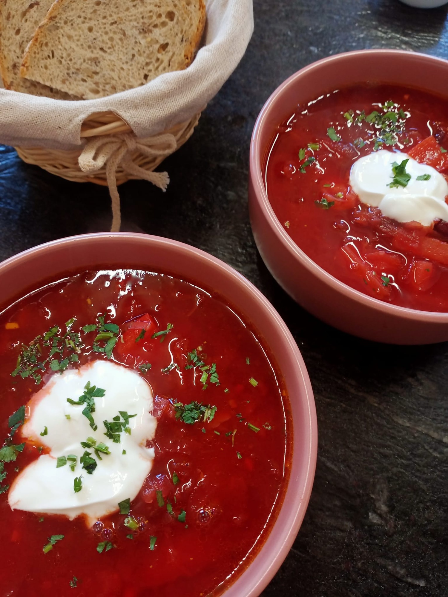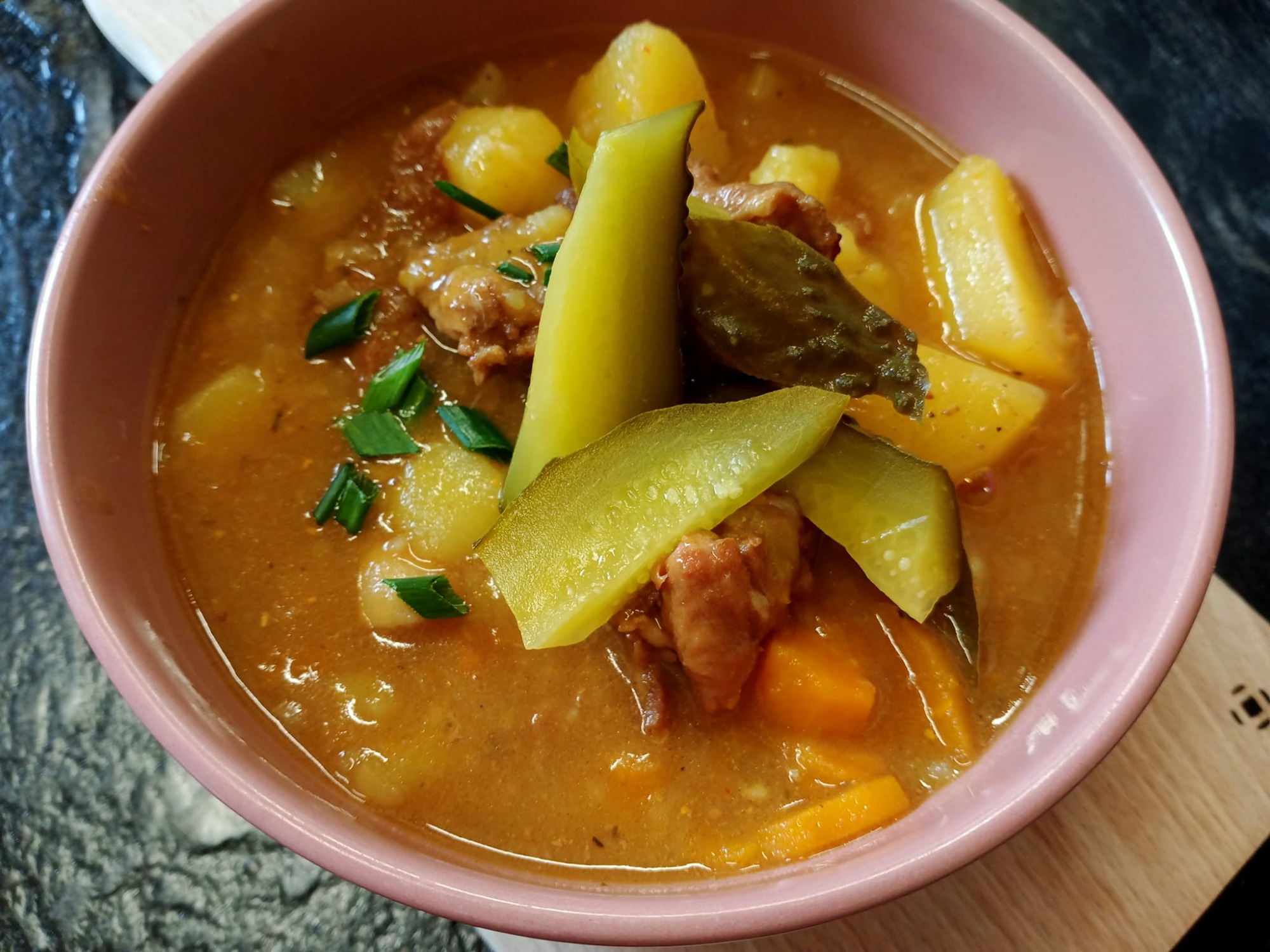 Aromatyczny barszcz grzybowy na zakwaszonym soku z kiszonej kapusty, serwowany z delikatnymi pierogami (5szt) nadziewanymi kaszą perlową i grzybami.